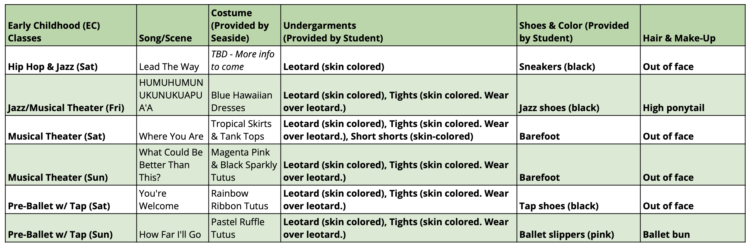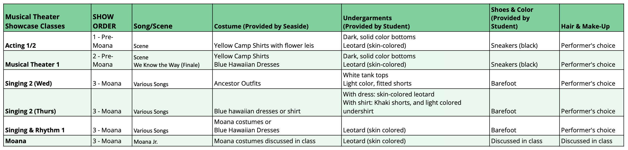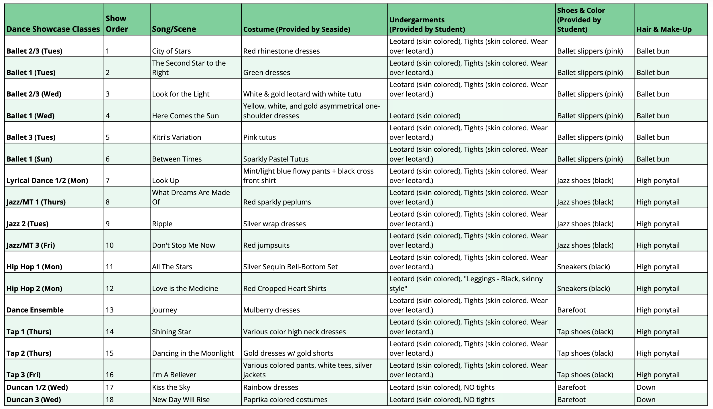 - Costume: Seaside provides performance costumes, however, there are some basics all students need to bring, which are shared in the table below.